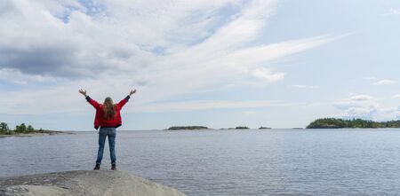 girl in a red jacket with raised arms is standing on a huge boulder. White clouds in the blue sky. Copy space.