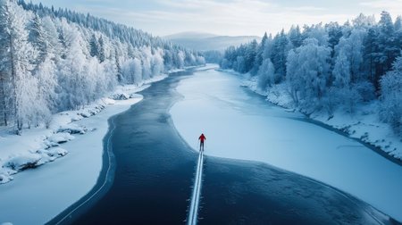 A cross-country skier gliding over a frozen river surrounded by frosted pine trees
