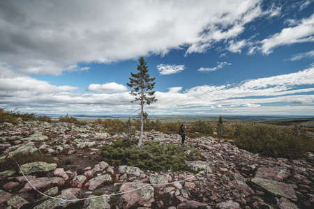 Swedish autumn fall vibrant landscape during hiking to Kurravaara mountain in Norrbotten county, Kiruna Municipality, Northern Sweden