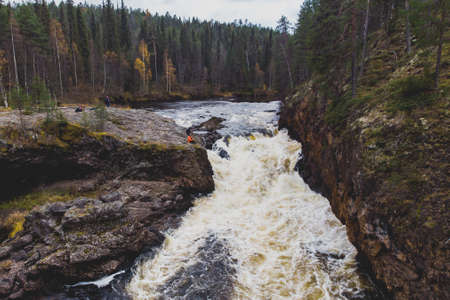 Cliff, stone wall, forest, waterfall and wild river view in autumn. Fall colors - ruska time in Myllykoski. One part of Karhunkierros Trail. Oulanka National Park in north Finland. Lapland, Europe