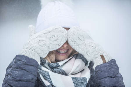 Girl wearing braces and winter clothes covers her eyes with wooly gloves.