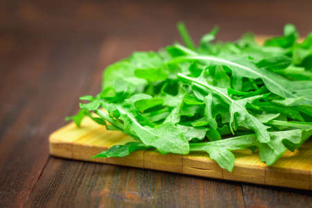 Fresh arugula salad leaves are lying on a wooden table. Place under the text