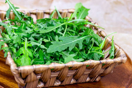Fresh green spicy arugula salad leaves in brown wooden basket on light background.