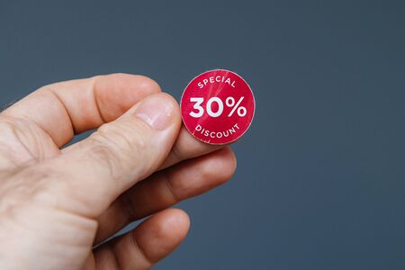 Man hand with glue sticked discount sale 30 percent special price red tags to be glued on goods during sale season - isolated gray background