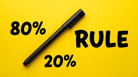The image features a bright yellow background with a black pen lying diagonally across it. The words '80%' and '20%' are positioned on either side of the pen, with the word 'RULE' prominently displayed in the center. This visual representation suggests a concept of rule distribution or importance between two different percentages.