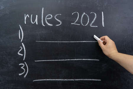 A hand writes text on a chalkboard RULES 2021