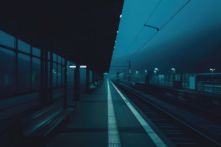 Two train platforms are visible in a low-angle perspective, bisected by a bright yellow line. Overhead structures shelter waiting passengers. The composition features a symmetrical arrangement, with tracks and infrastructure against a clear, blue sky. This image may be suitable for various commercial uses, including transportation and travel themes.