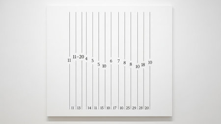 presents a piece of abstract characterized by a clean white background and a precise arrangement of black Numerous thin, vertical lines are drawn in parallel, creating a grid-like structure. Interspersed within this linear pattern are black numbers, some appearing in isolation and others forming small sequences or ranges. The numbers are positioned both above and below the horizontal midline of the composition, with some lines extending to connect or frame them. The overall effect is a...