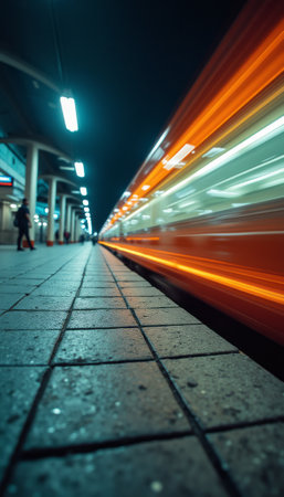 A vibrant train rushes past a dimly lit platform, creating a stunning blur of orange and white lights. The image captures the exhilarating energy of urban life, showcasing the contrast between the stillness of the platform and the swift movement of the train.