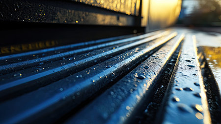This close-up image captures the intricate details of a rain-soaked metal surface, showcasing shimmering water droplets under soft evening light.