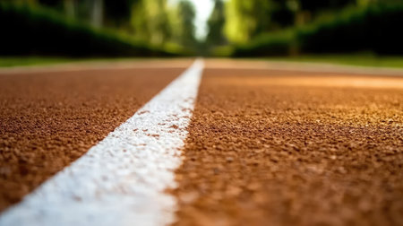 The close up perspective showcases a red athletic track surface with clearly defined white lane markings stretching into the distance. Sunlight illuminates the scene highlighting the texture of the track while lush greenery lines the background creating a vibrant and inviting atmosphere for athletes