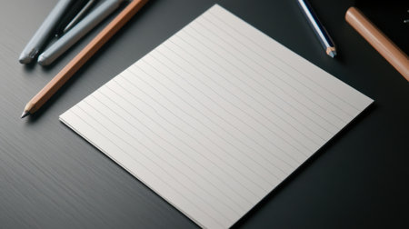 A blank lined note paper on desk surrounded by pencils and pens