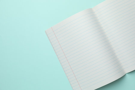 Open copybook on light blue background, top view. School stationery. Space for text