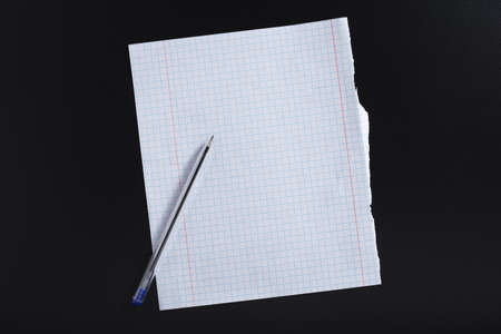 Sheet from a school notebook and pen on black background, top view