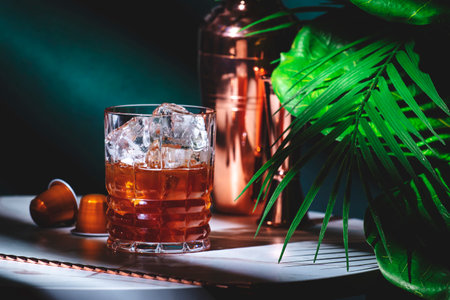 Enjoying a bourbon cocktail with ice in a glass on a dark wooden table at a cozy bar in the evening