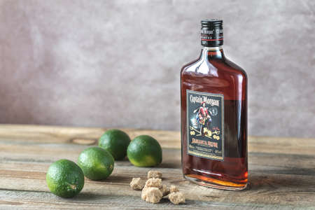 SUMY, UKRAINE - MAR 01, 2018: Captain Morgan rum bottle. Captain Morgan is a brand of rum and the second largest brand of spirits in the United States.