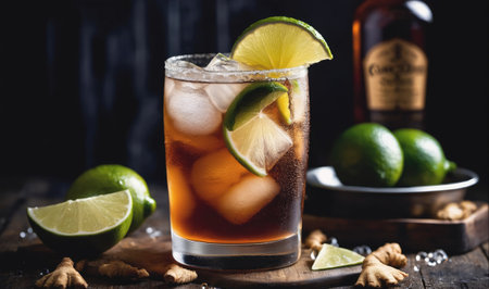 A glass of rum and coke garnished with lime wedges sits on a wooden surface with ginger root and lime wedges