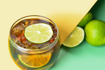 Cuba Libre cocktail. Alcoholic drink with cola, rum, lime and mint. Cuba Libre or long island iced tea cocktail.