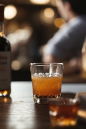 Sipping fine spirits in an elegant glass at a vibrant bar setting