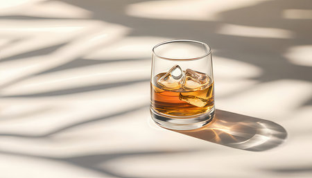 A Glass of Whiskey with Ice Cubes, Soft Shadows, and a Blurred Background