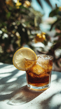 Refreshing glass of iced coffee with sunlit shadow of palm leaves. That the image is generated using AI.