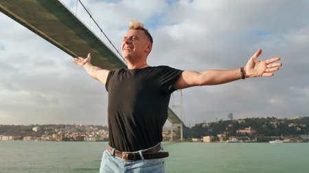 A young man admires the huge bridge over the Bosphorus in Istanbul. Turkey.
