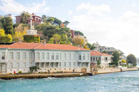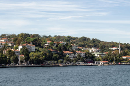 View of buildings by Bosphorus in Rumeli Hisari neighborhood on European side in Istanbul. It is a sunny summer day. Beautiful travel scene.