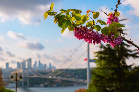 Istanbul at spring. A judas tree or Judas tree with cityscape of Istanbul on the background. selective focus.