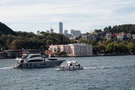 View of a yacht and fishing boat passing on Bosphorus and Baltalimani neighborhood on European side of Istanbul. It is a sunny summer day. Beautiful travel scene.