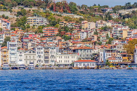 View of buildings by Bosphorus in Rumeli Hisari neighborhood on European side in Istanbul. It is a sunny summer day. Beautiful travel scene.