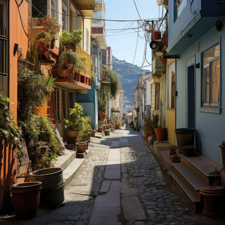 Steep backstreet view with laundry hanging between weathered buildings, capturing daily life and residential texture in a lived-in urban community