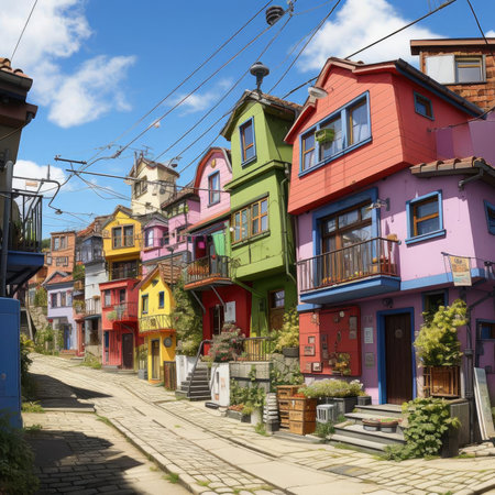 Colorful urban street with people walking, parked cars, and vibrant buildings, lively atmosphere in a charming neighborhood