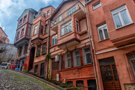 Istanbul, Turkey - August 28, 2022: Beautiful old traditional wooden and stone houses, and stone staircase, in old Balat district, on a summer day