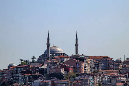 Cityscape of Golden horn with ancient and modern buildings in Istanbul Turkey from the Bosphorus strait on a sunny day with background cloudy sky