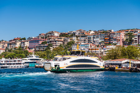 view of the passenger ferry and the Bosphorus against the background of the urban architecture of Istanbul, Turkey
