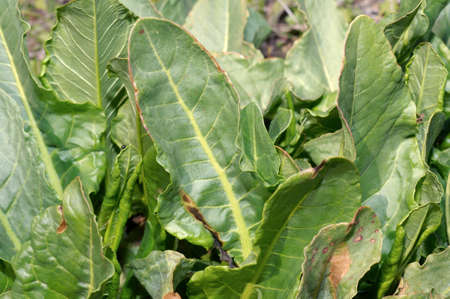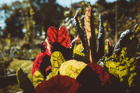 Close up to detail of swiss chard leaf in vegetable garden. Selective focus.