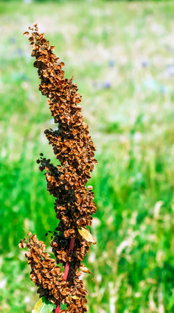 Close-up of brown curly dock seeds with green blurred plants on background