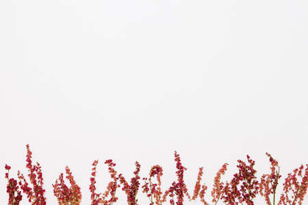 Red field flowers in the bottom of white background, flat lay