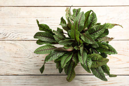 leaves of sorrel on wooden background. top view