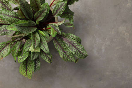 Sorrel plant on gray table, top view. Space for text