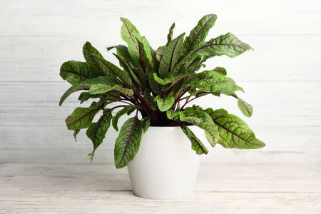 Sorrel plant in pot on white wooden table