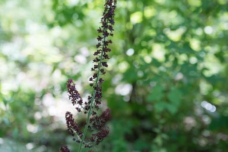 Inflorescence of black false hellebore (Veratrum nigrum L.) on a green background in the forest.