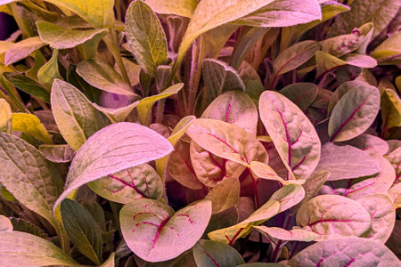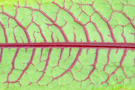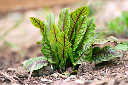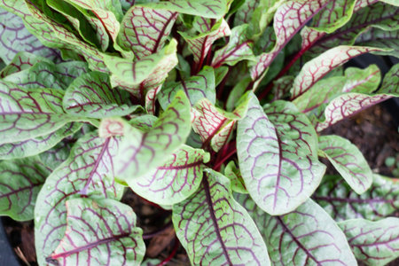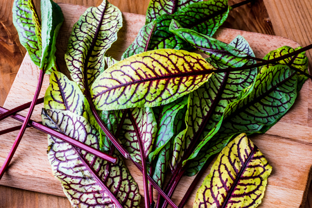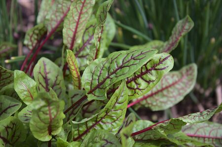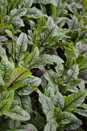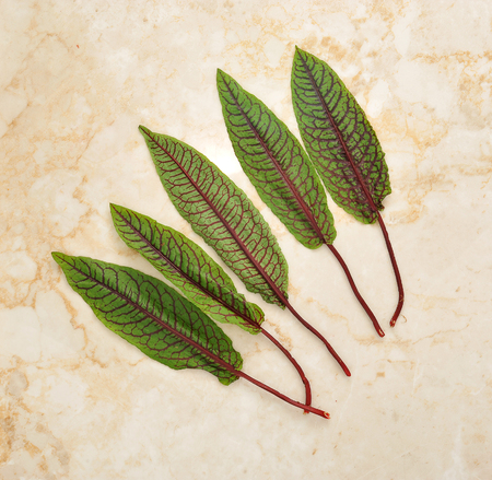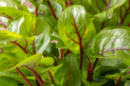 A variety of fresh green sorrel leaves, in closeup, showing the distinctive red veins.
