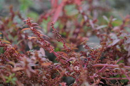 Seeds of red vegetable amaranth on a plant branch, in the gardener's hand. decorative edible plant.
