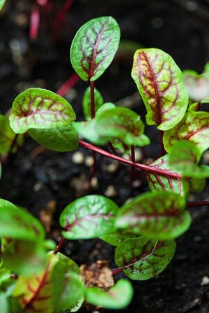 Red beetroot, fresh sprouts and young leaves front view . Vegetable, herb and microgreen. Also beet, table, garden or red beet. Macro photo with water drops.