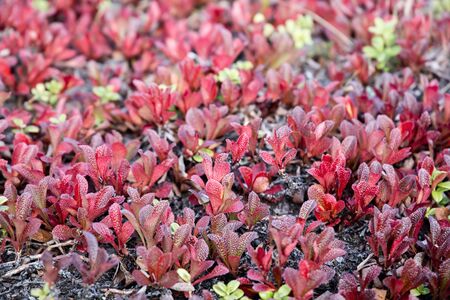 Close up of a green plant with red hued flowers and buds in the countryside.