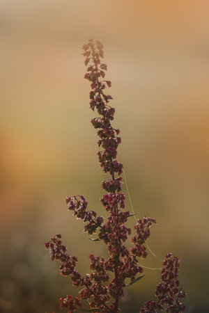 Part of a sorrel bush (Rumex confertus) growing in the wild with dry seeds on the stem