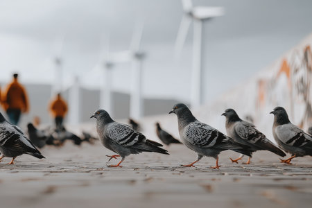 A captivating scene of a group of pigeons pecking at broken glass on an urban pathway, with wind turbines providing a distinctive backdrop, showcasing the interaction of wildlife in a city setting.