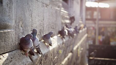 Pigeons in a city. concept of dirty hungry birds in the town