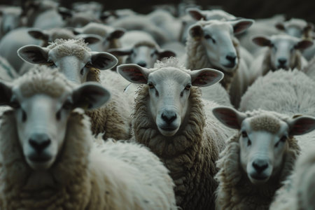 A group of sheep gathered closely, emphasizing the lead sheep in a natural outdoor setting, conveying unity and togetherness.